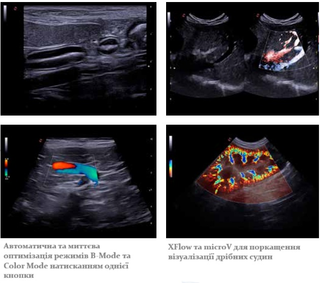 - Базові режими сканування: B-Mode, M-Mode, CFM Mode (кольорове картування), Power Doppler, Directional Power Doppler, D-mode steering, TP View (трапецієвидне сканування)