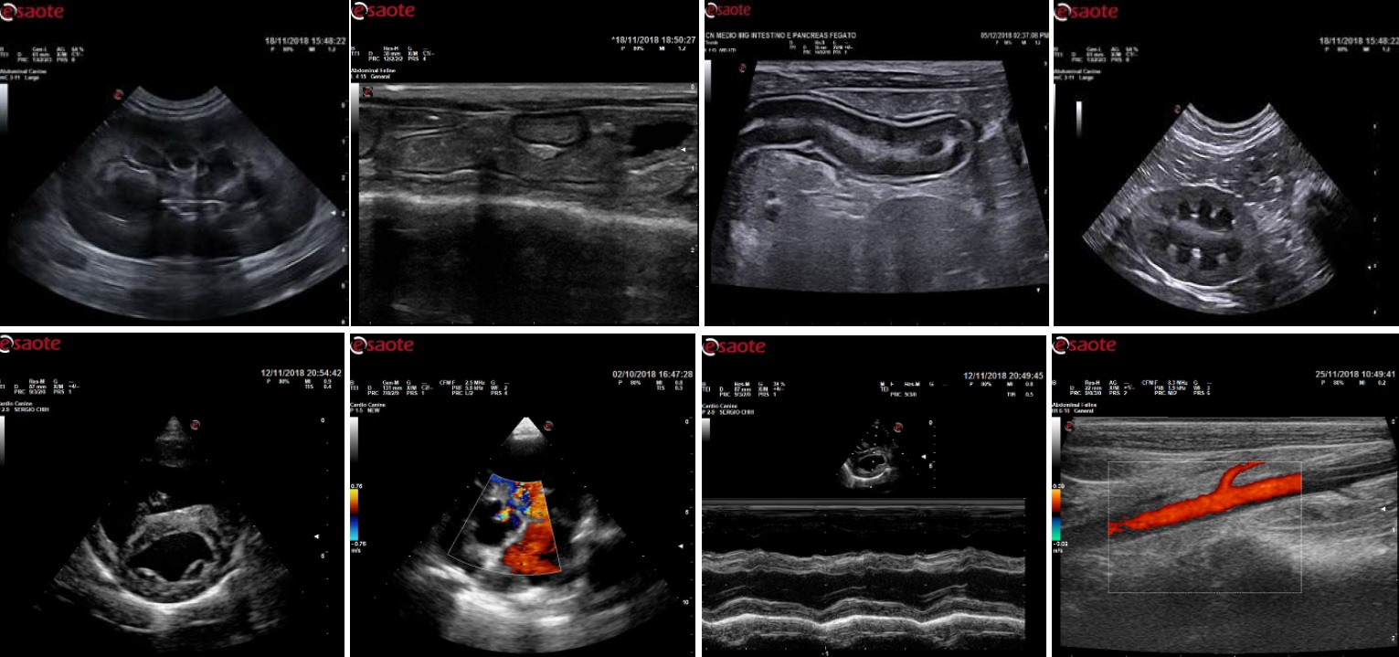 Колаж з 8 ветеринарних ультразвукових знімків, отриманих на системі MyLab Alpha VET. Зображення включають абдомінальні дослідження, кардіологічні знімки та дослідження судин з кольоровим допплером
