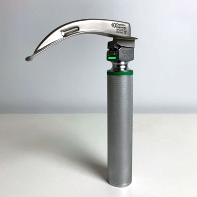 Волоконно-оптичний ларингоскоп Macintosh у зібраному стані. Видно рукоятку із зеленим кільцем та приєднаний клинок Macintosh