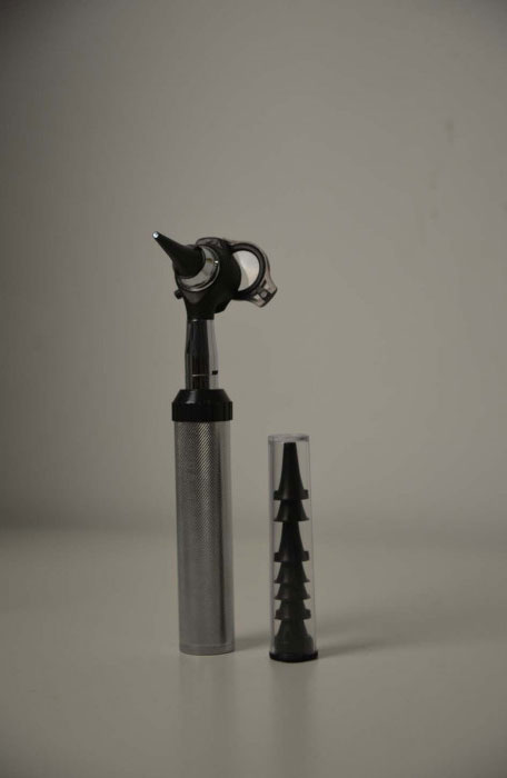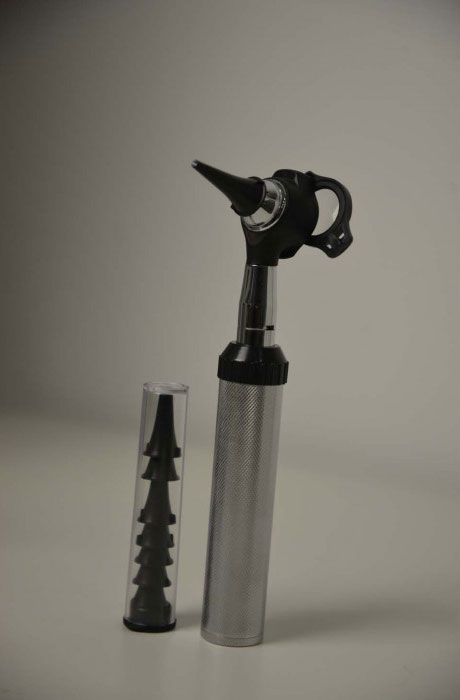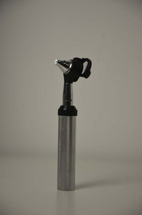 Отоскоп з набору LTI-109 Vet у зібраному вигляді. На фото показана металева рукоятка з приєднаною отоскопічною головкою та вушною воронкою