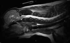 Знімок МРТ, зроблений на апараті vet-MR Grande. На зображенні показано МРТ-скан хребта собаки в сагітальній площині, демонструючи структуру хребців та міжхребцевих дисків.