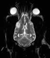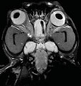 На зображенні показано МРТ-скан голови собаки в аксіальній площині на рівні очей та носової порожнини, демонструючи очні яблука, зорові нерви та навколоносові пазухи