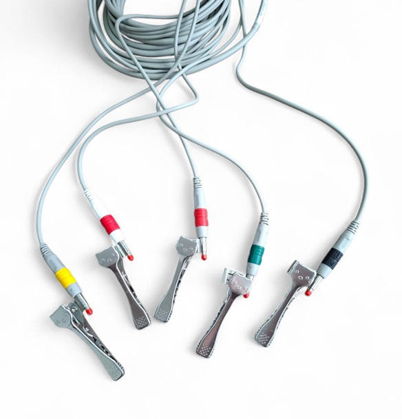 Кабель ветеринарного електрокардіографа Е-3 з 5 електродами-затискачами типу Крокодил. Кольорове маркування штекерів відповідає ветеринарним стандартам для швидкого підключення дрібних тварин
