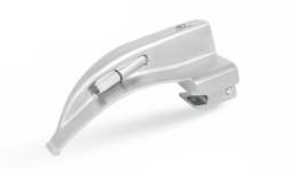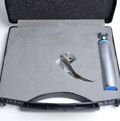Відкритий кейс з ларингоскопним набором: у ложементі окремо лежать металева рукоятка та вигнутий клинок типу Macintosh