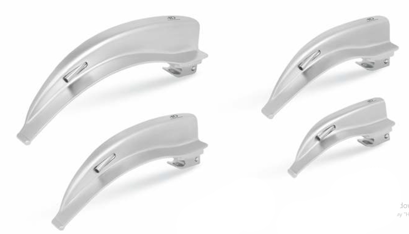 Чотири вигнуті клинки Macintosh розмірів 1, 2, 3 та 4 з набору Doctor Devices. Клинки виготовлені з матової сталі та мають конструкцію зі знімним світловодом